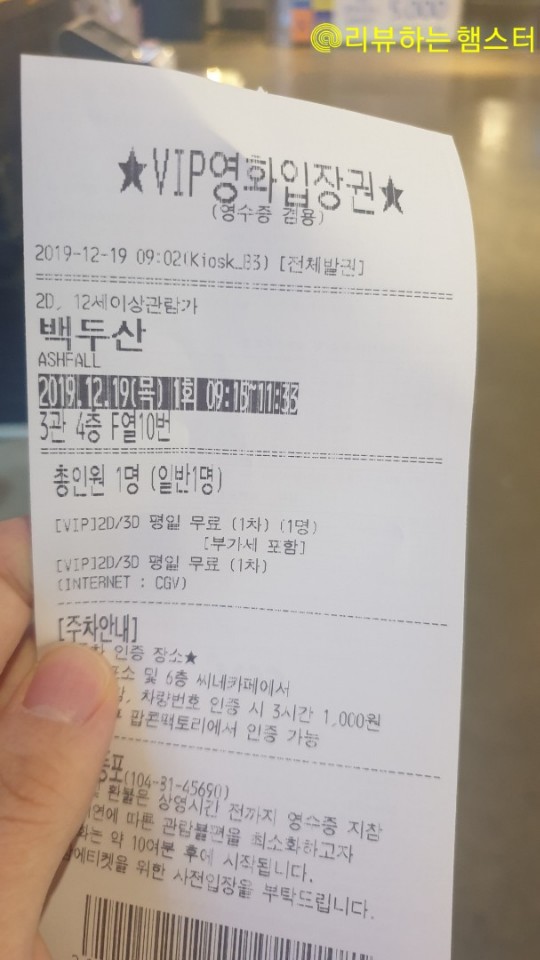 이번에 본 백두산은 VIP혜택으로 받은 평일 무료 관람 쿠폰을 이용해서 봤다.