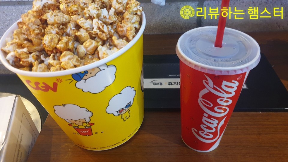 이 팝콘과 콜라까지 세트로 나오는데, 달콤팝콘 +1500원해서 계산했다.