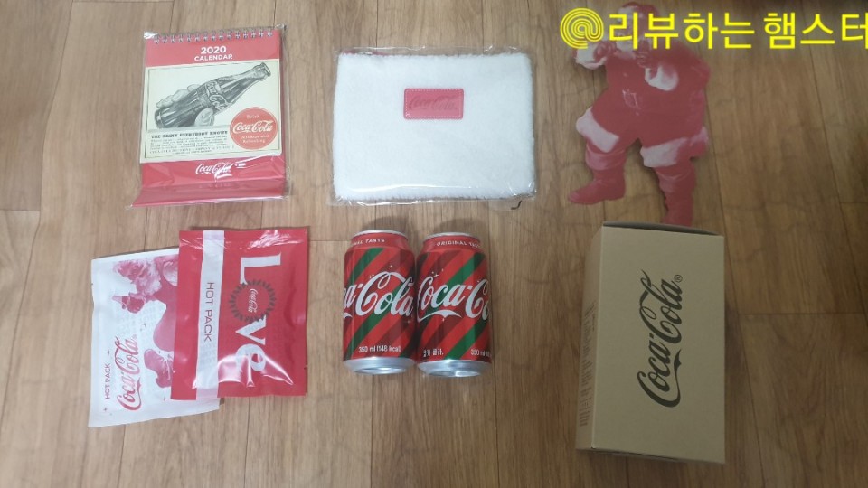 크리스마스 한정판 콜라 2개 X 핫팩 2개 X 2020년 미니캘린더 X 코카콜라 파우치 X 라유저물컵으로 구성되어있다. 하나씩 살펴보자.