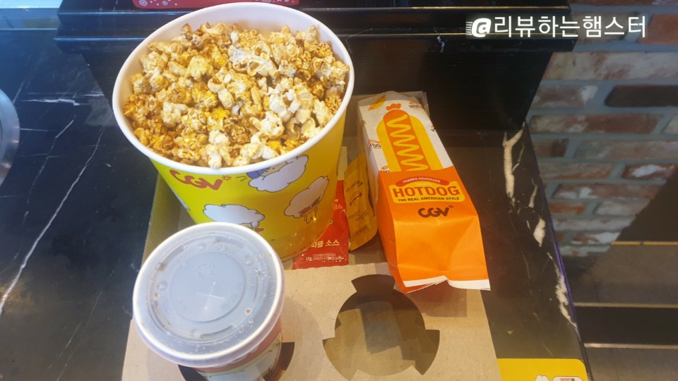 일부매장에서는 오리지널 핫도그로 팔고있지만 CGV용산아이파크몰은 플레인핫도그(단품 4000원,세트 시 2500원)을 아직 팔고 있어서 이번에 주문했다. 글쓴이는 참고로 아침에 일어나자마자 출발해서 아무것도 먹지도 못했다. 그래서 달콤팝콘L와 콜라 그리고 핫도그를 먹었다.