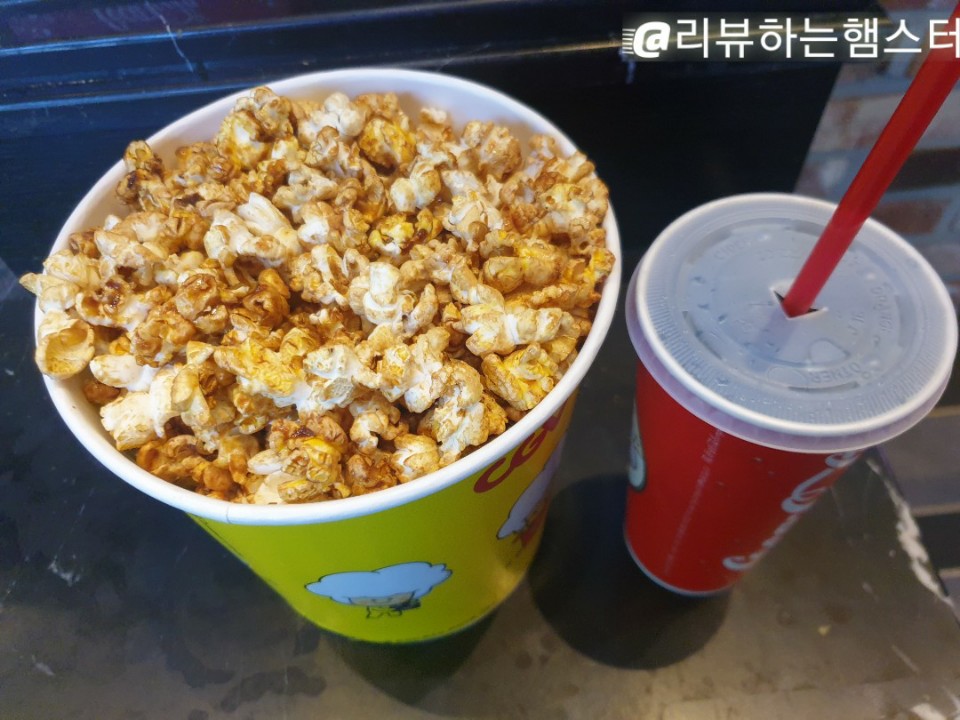 가격은 7700원이고 이번에는 포도환타랑 달콤팝콘L를 먹었다.