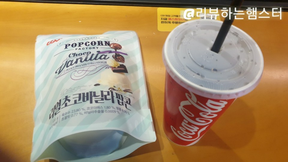 건즈아캄보 보기전에 다른영화를 봤을때 달콤팝콘L를 먹다보니 포만감이 생겨서 이번에는 리얼초코바닐라팝콘을 따로 시켰고(4500원) 음료는 먹다가 남아가지고 영화보면서 다 먹었다.