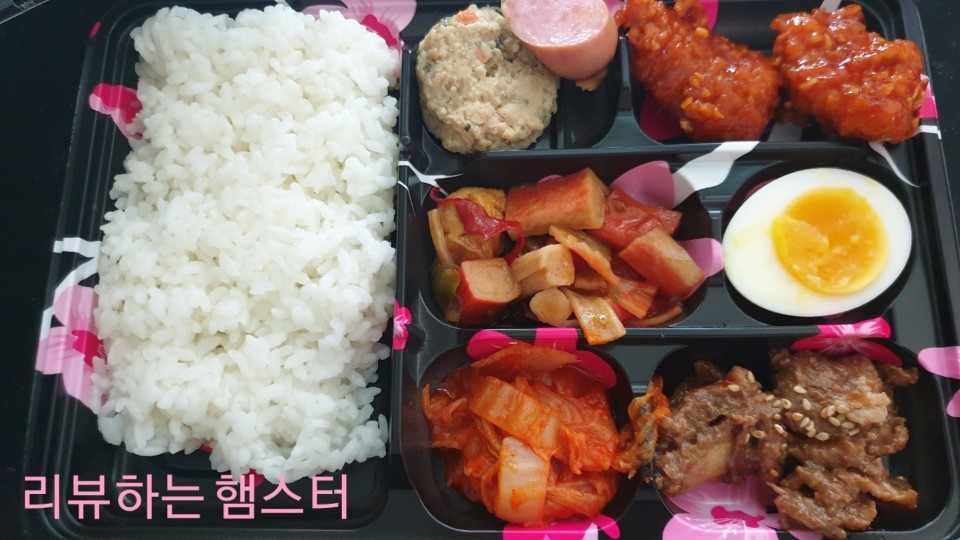 볶음김치,게맛살,동그랑땡,소세지,치킨(매운거),고기,계란 이렇게 들어있는데, 가격에 비해 양이 많은 모습을 알 수 있다.