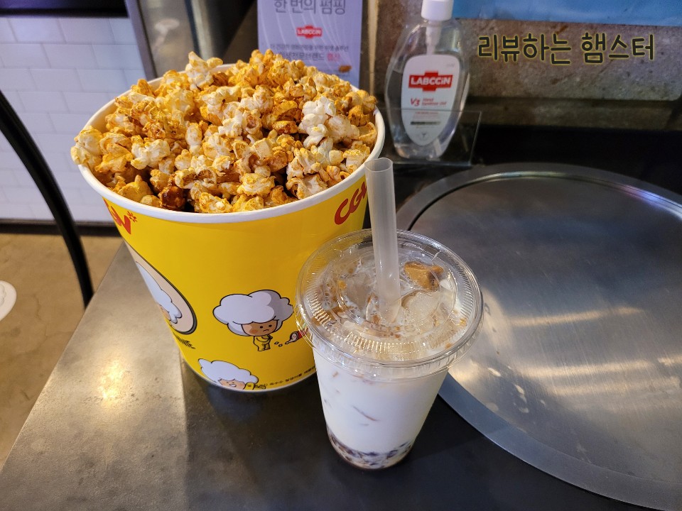 호러영화여서 그런지 팝콘은 금방 먹었는데 흑당버블티는 한 반정도 먹은것 같다.