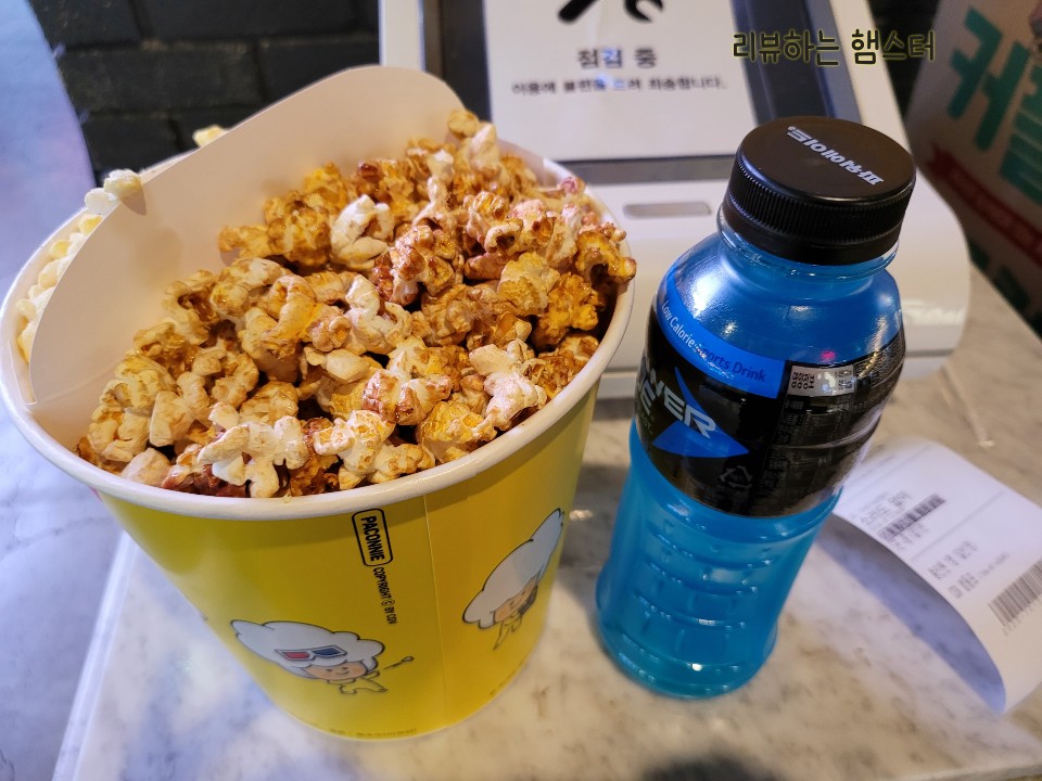 하지만 글쓴이는 요새 탄산을 피해서 먹고 있으므로 파워에이드랑 반반팝콘L를 먹었다.