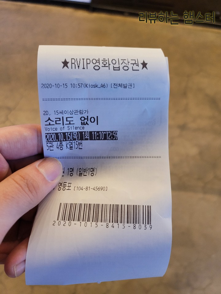 이번에 본 영화는 소리도 없이 이다. 어떤 영화를 볼지 고민을 많이했었는데, 글쓴이가 이제 얼마안남은 RVIP영화티켓을 써야되서 2D영화를 고르다가, 이름이 좀 특이해서 소리도 없이를 골랐다.