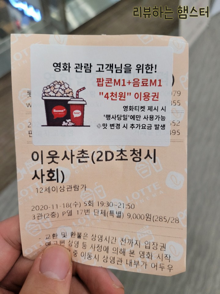 티켓을 받자마자 가장 놀라웠던점은 팝콘M+음료M이 4000원이라는 점이다.