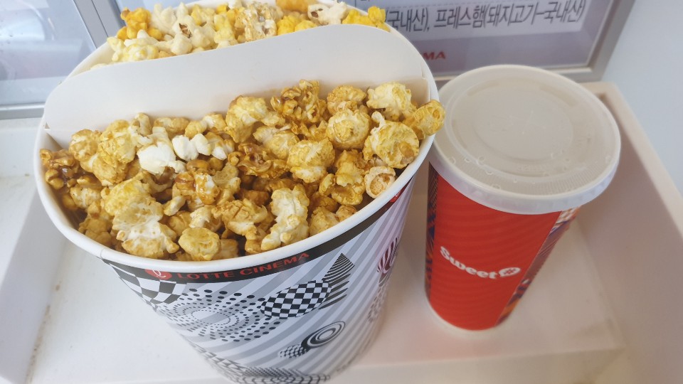 롯데시네마를 오면 보통 반반팝콘을 많이시키며, 치토스하고 달콤이 정말 잘 어울린다고 생각한다.