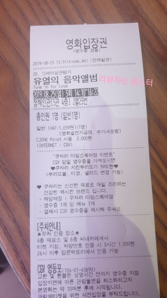 이번에 본 영화는 글쓴이가 가장 기대하던 유열의 음악앨범이다. 원래는 수요일날 보려고 했었으나, 주말에 혹시나 기회가 있나 해서 했는데, 마침 있었다. 하지만 좌석이 거의 다 나가서 거의 맨 오른쪽좌석으로 결정하였다.