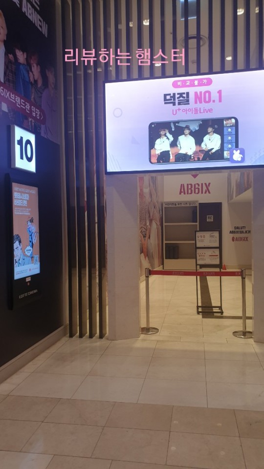 롯데시네마 10관은 AB6IX관으로 7층에서 올라가는 에스컬레이터 바로 옆에 위치되어있다. AB6IX관이라는 곳은 이번에 처음인데, AB6IX라는 아이돌 그룹을 따서 만든 관인것 같다. 저번에 영등포에서 리뷰했던,정해인관과 비슷한 관인것 같다.