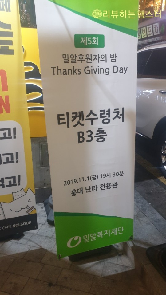 밀알 후원자의 밤은 홍대에 있는 홍대난타극장에서 진행되었으며, 6시 넘어서 부터 지하 3층에서 티켓을 배부했다.(단 후원자의 밤 신청자만 티켓을 받을 수 있으며, 1인 2매를 제공했음)