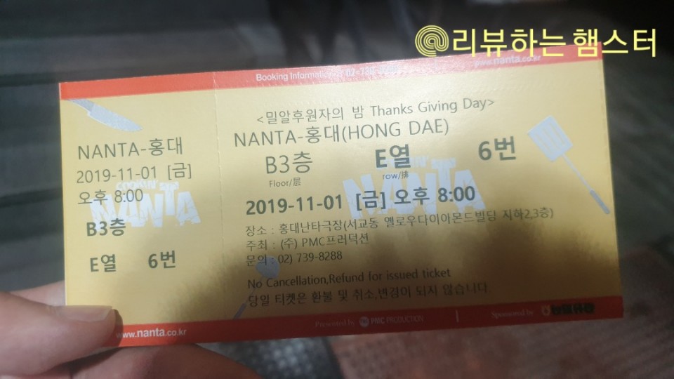글쓴이는 이날 난타를 혼자보러가서 1개만 수령을 했고, E열에 앉았다.