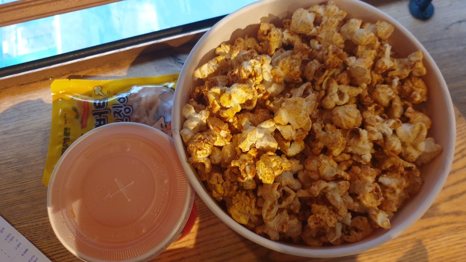 싱글세트(6000원)인데 달콤팝콘L(+1500원) , 오징어(+2000원)해서 9500원에 먹었다.